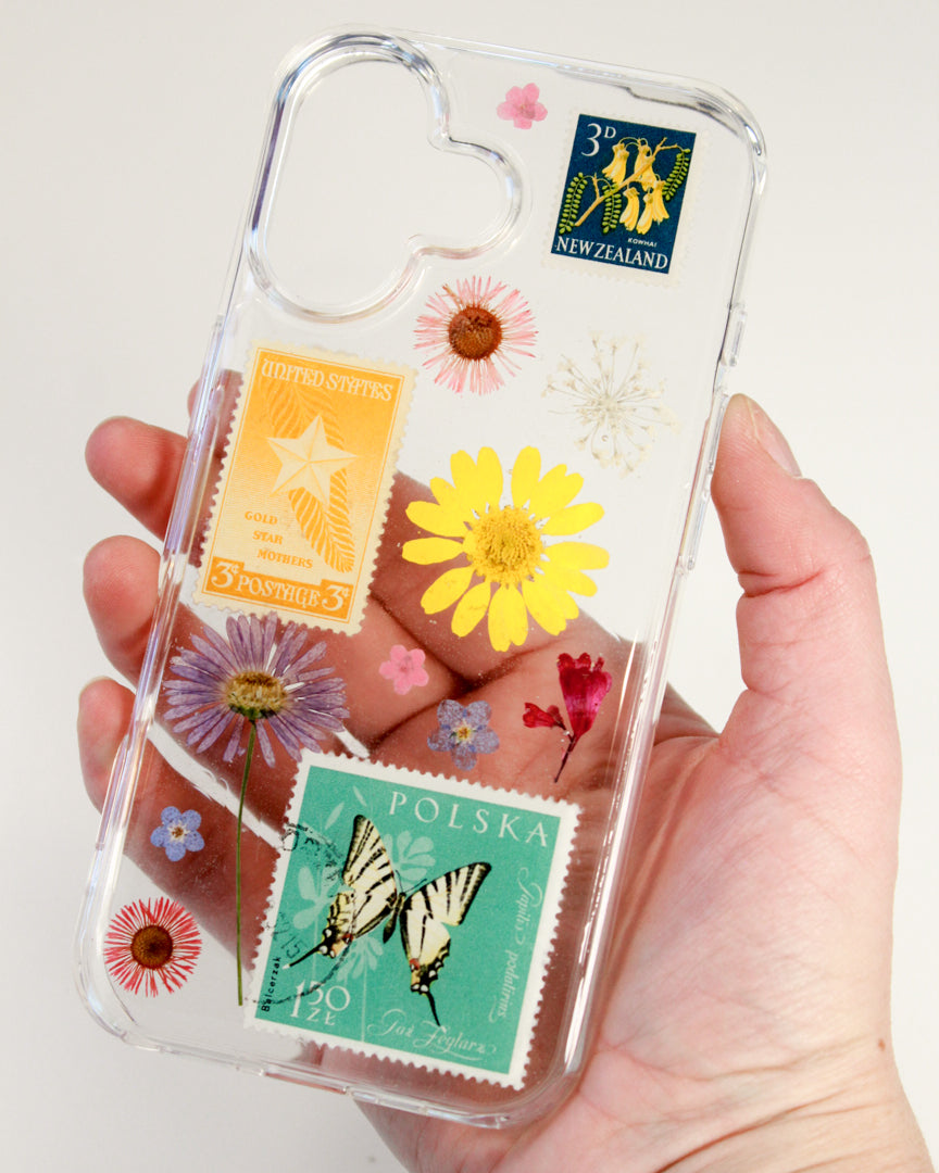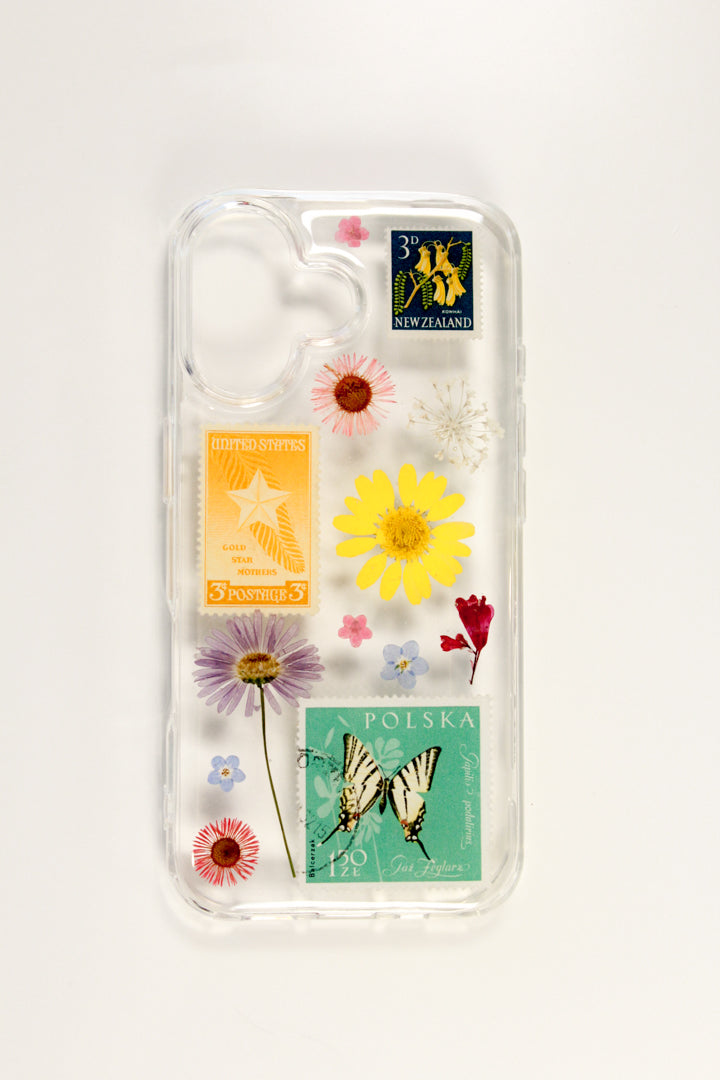 ONE-OF-A-KIND! This case was individually made by hand with real postage stamps and/or pressed flowers.