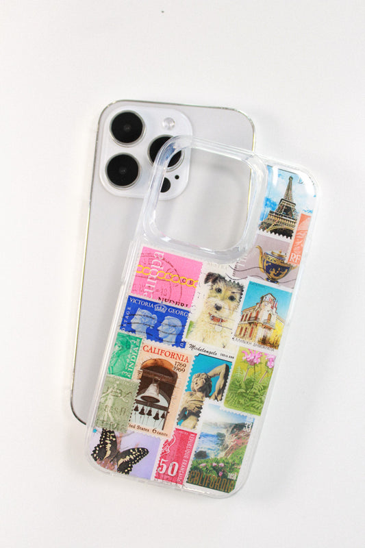 each case is made from a high-quality, clear anti-yellowing phone case, handcrafted one-by-one with genuine postage stamps & real pressed flowers.